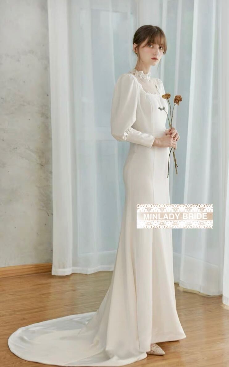 シルクサテン バルーンスリーブ マーメイドウェディングドレス