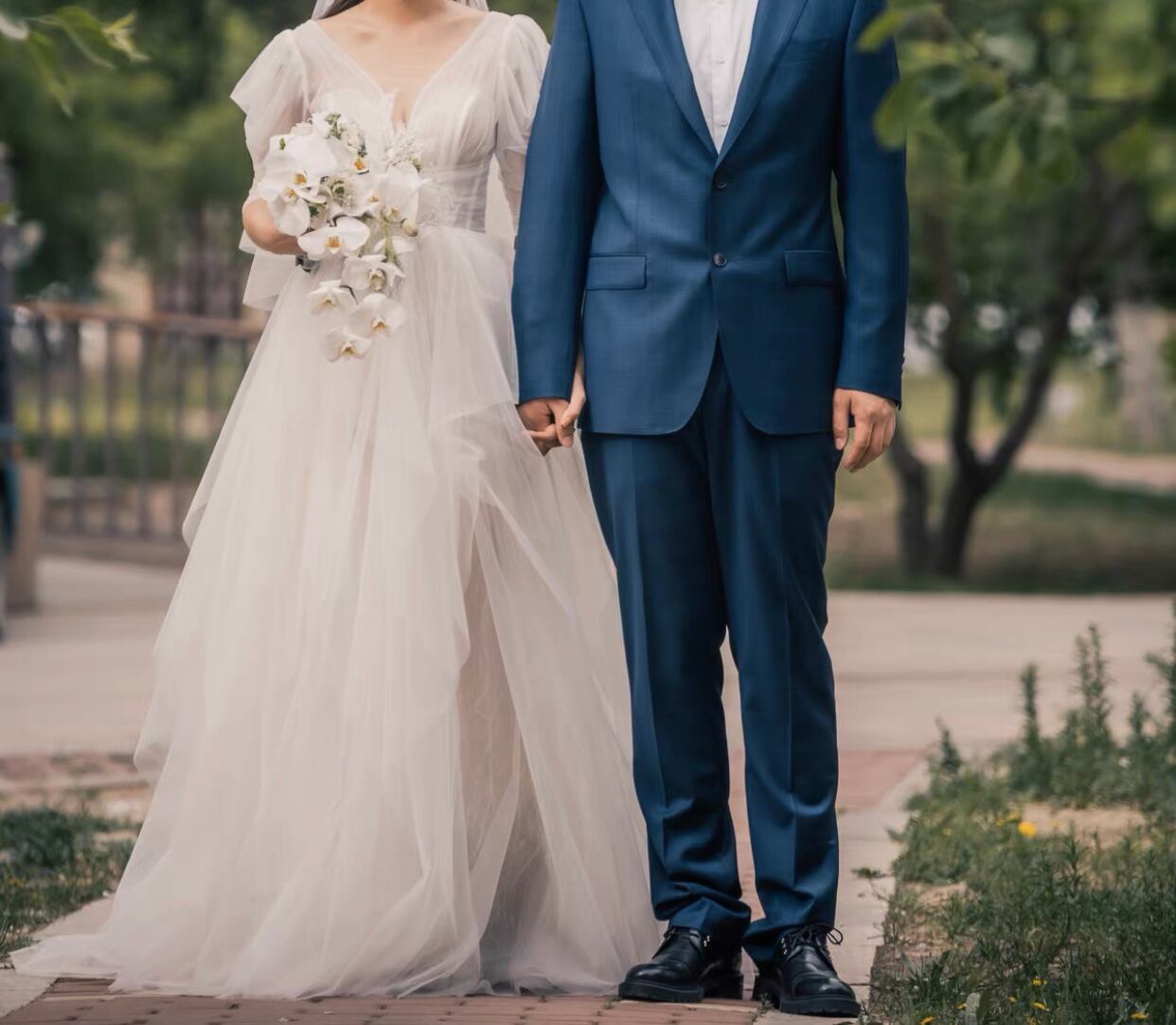 Vネックの首元が大人っぽく見せてくれるシンプルなデザインウェディングドレスです。