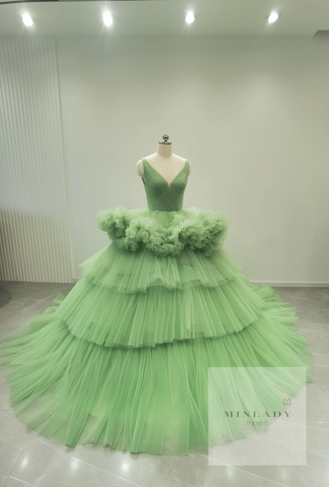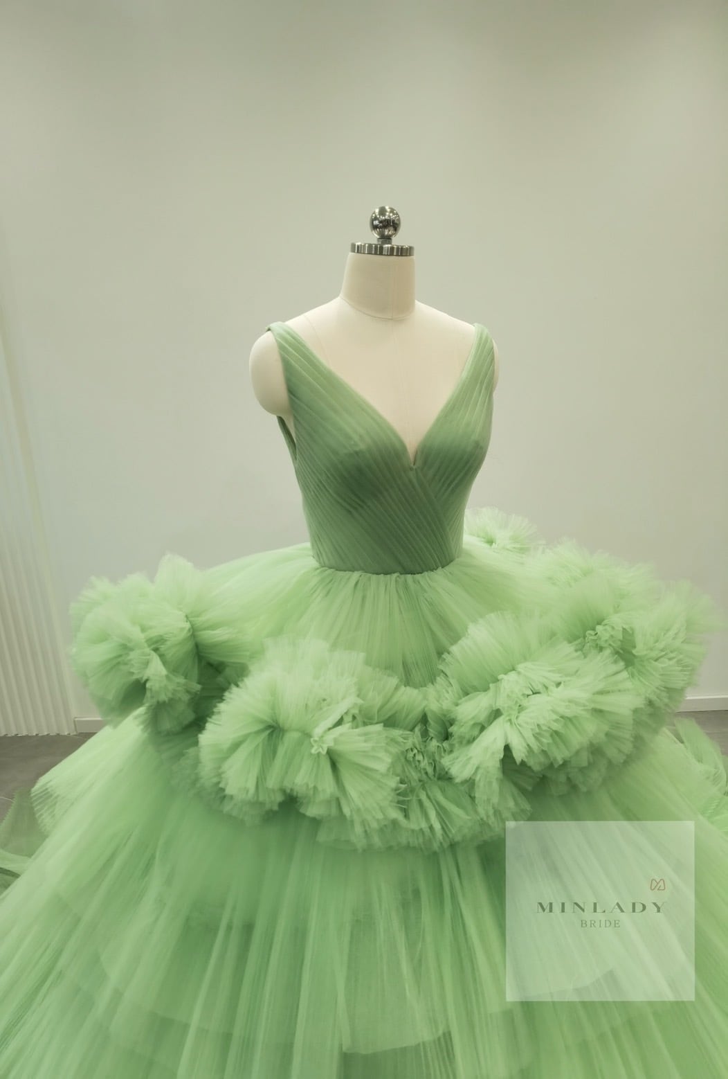 淡いグリーンが目を惹くふわふわのチュールドレスとなります。